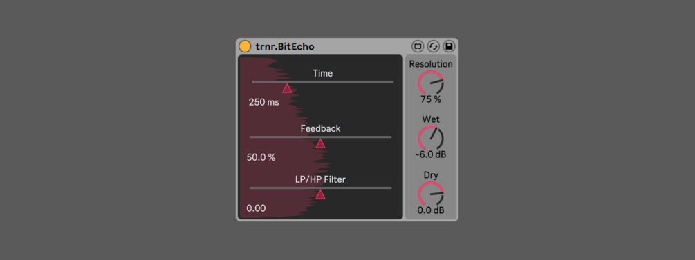 BitEcho is an 80s inspired, modeled digital hardware delay with "pristine" 12 bit/33 khz sample resolution and 1 second delay time. The resolution can be brought further down from brittle, digital artifacts to absolute bit crushed mayhem. Inputs and outputs are clipping protected (which means that they can distort - just like a hardware device) and the delay time is gently modulated for subtle variations and stereo widening.