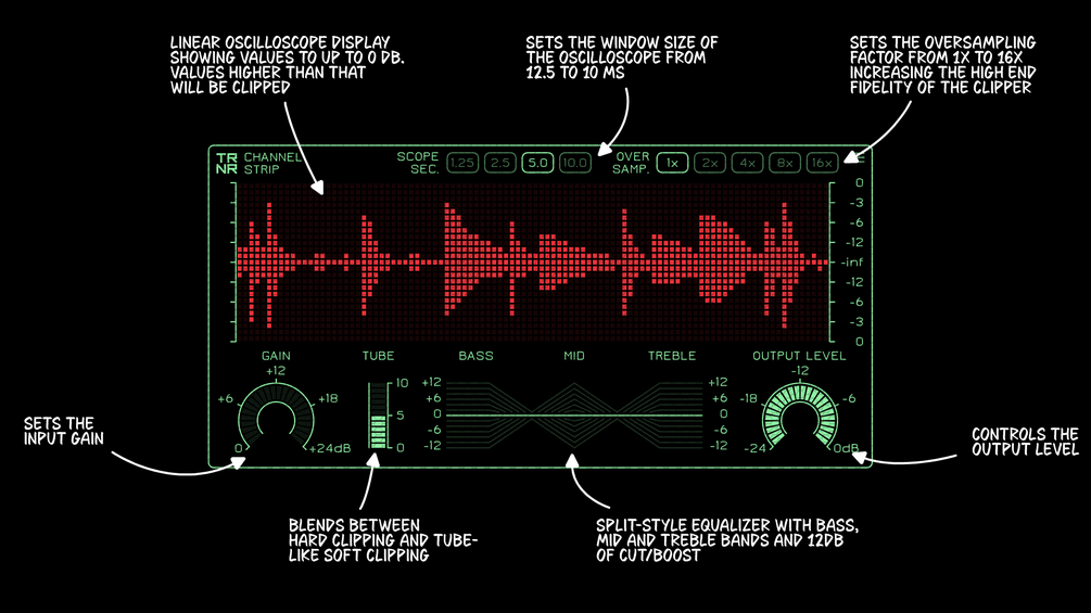 Controlling dynamics with saturation is an often overlooked technique in music production. ChannelStrip is intended as an end-of-chain effect giving you smooth modeled tube saturation combined with an oscilloscope to monitor how the waveform is compressed. The integrated 3-band equalizer will furthermore help you apply gentle, unobtrusive tone-shaping.