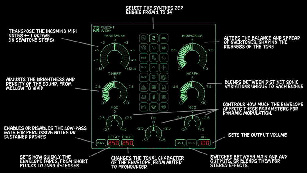 Flechtwerk merges the advanced synthesis capabilities of Plaits with a streamlined, performance-friendly interface – ready for bold, creative sound design across any genre.